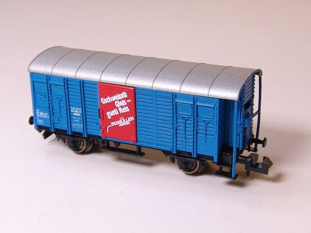 |  |  | 9058 | SBB | Gms | 30 85 94 05 608-4 | blau - gedeckter Güterwagen "Gschweissti Gleis = gueti Gleis Max Müller Horgen" | III | 61 |  |